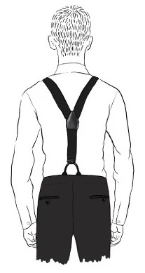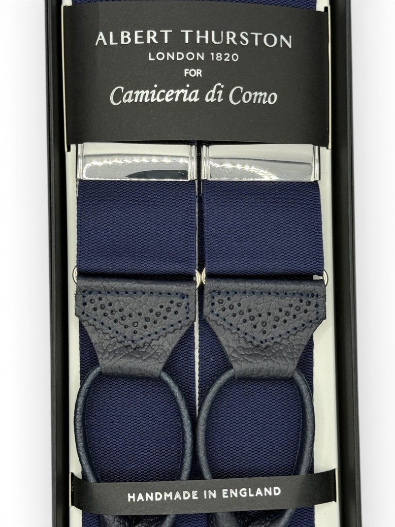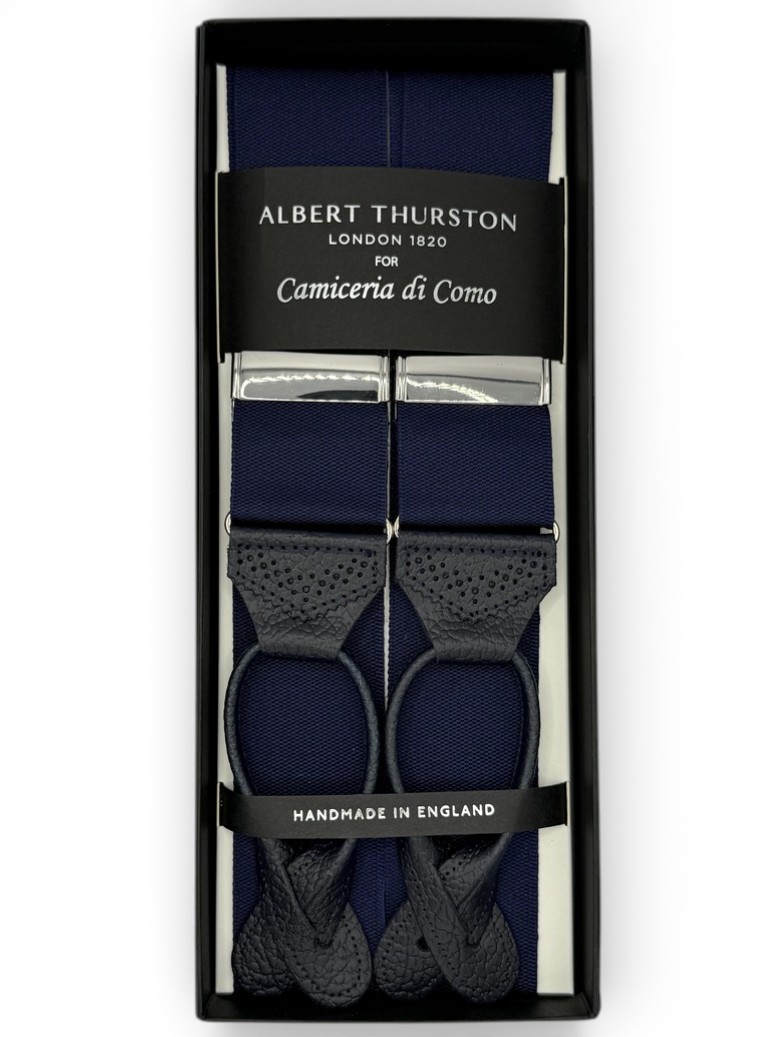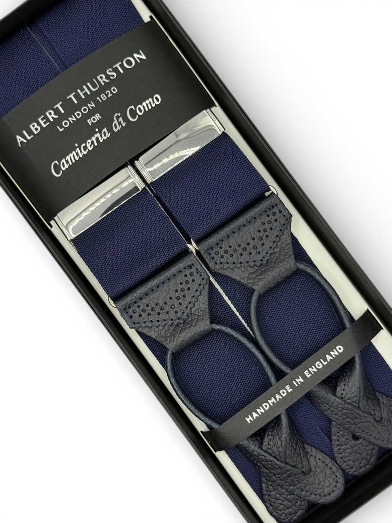 Bretelle barathea a Y Albert Thurston, colore blu navy. Attacco per bottoni e finiture in vera pelle blu martellata. Nastro rigido di larghezza 40mm, regolatori di lunghezza in nickel.