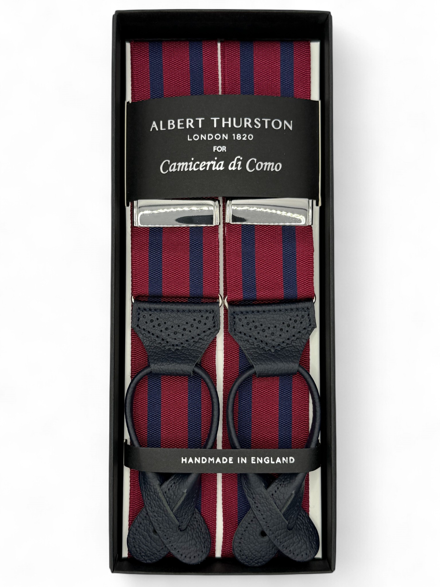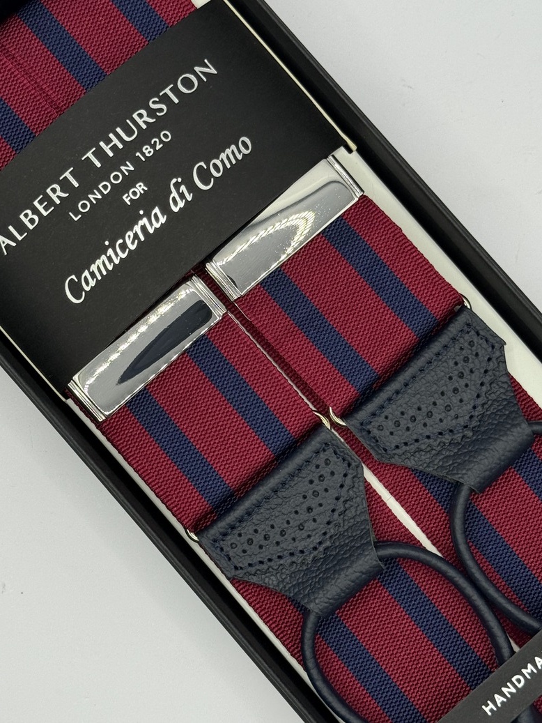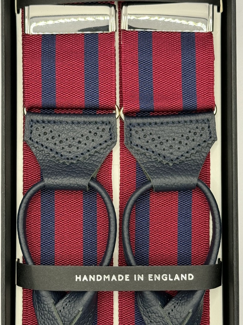 Bretelle barathea a Y Albert Thurston. Attacco ai bottoni e finiture in vera pelle blu navy martellata, lavorata brogue. Nastro rigido di larghezza 40mm, regolatori di lunghezza nickel.