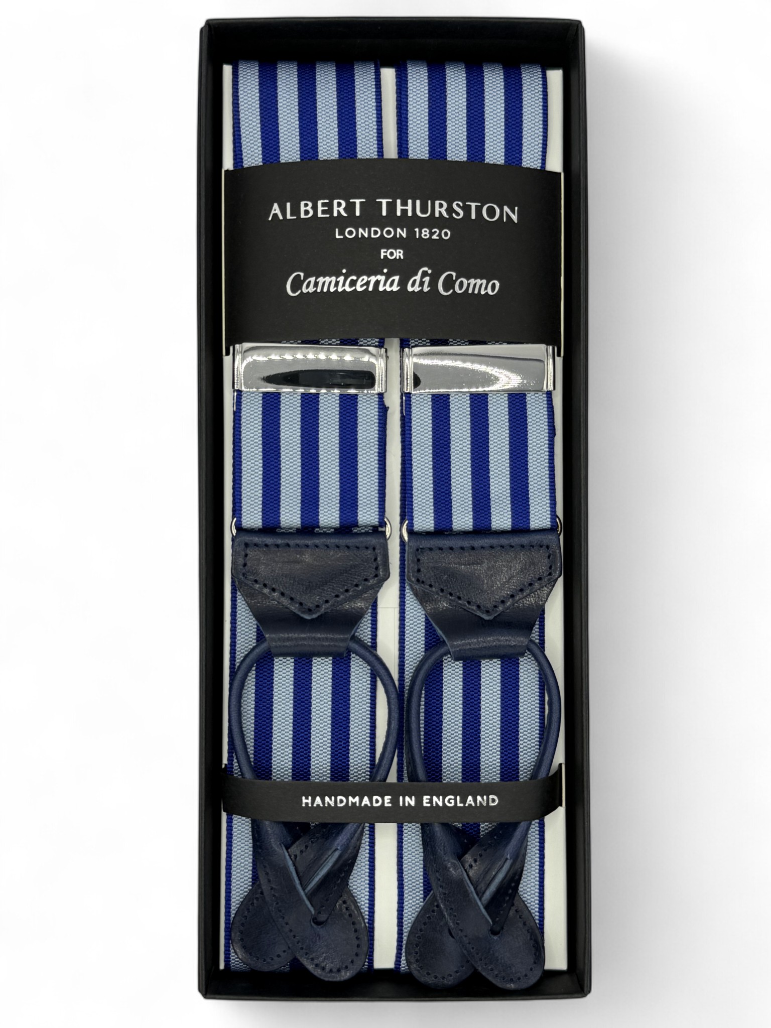 Bretelle barathea a Y Albert Thurston. Attacco ai bottoni e finiture in vera pelle smaltata blu. Nastro rigido di larghezza 40mm, regolatori di lunghezza nickel.