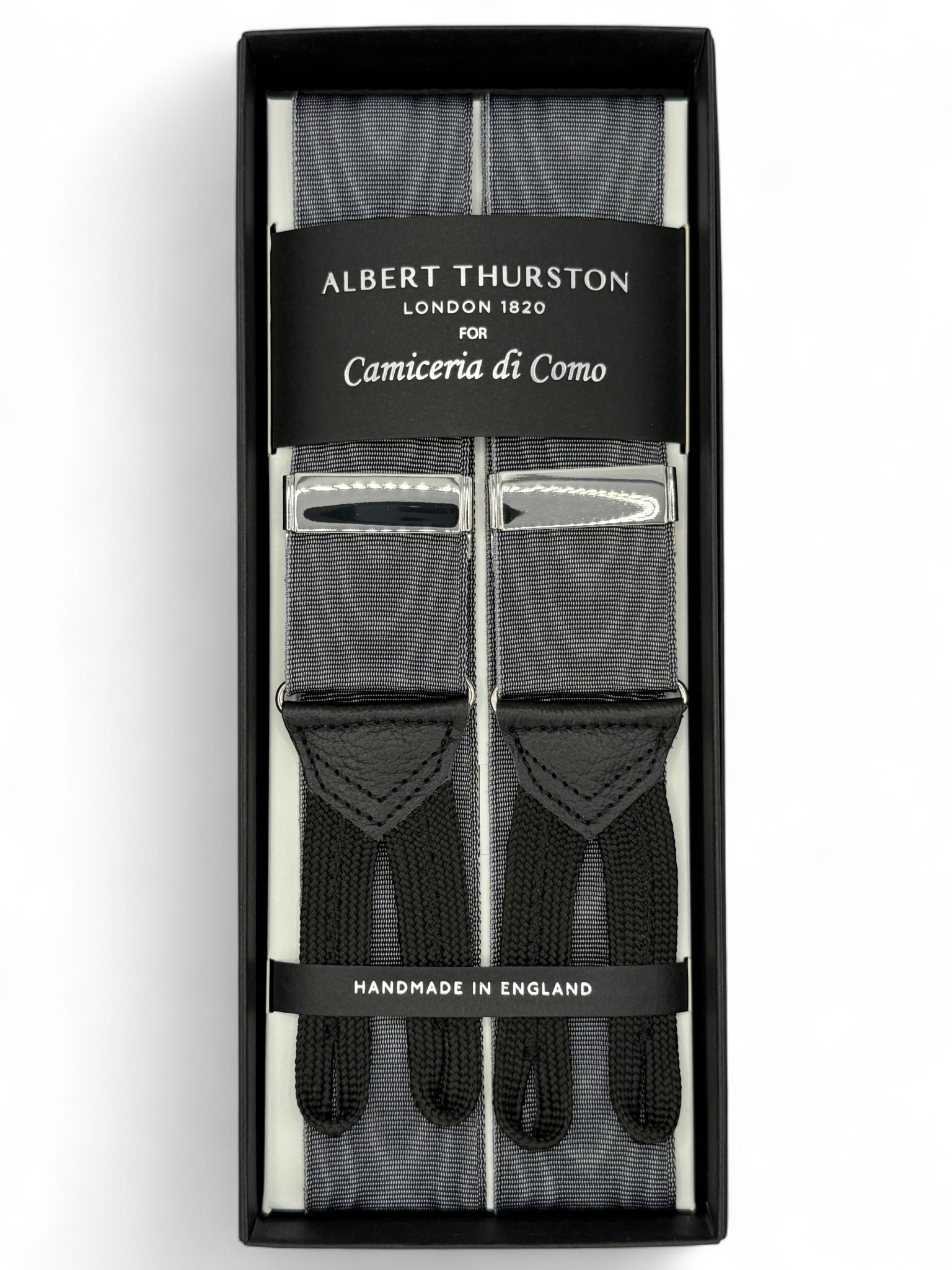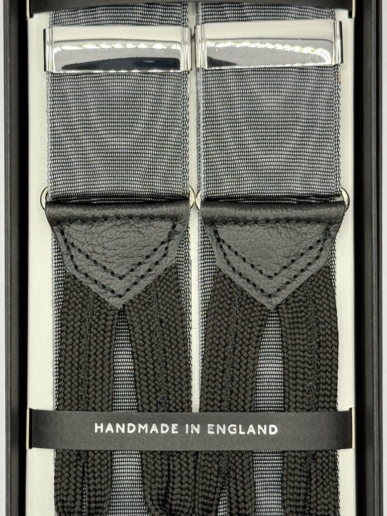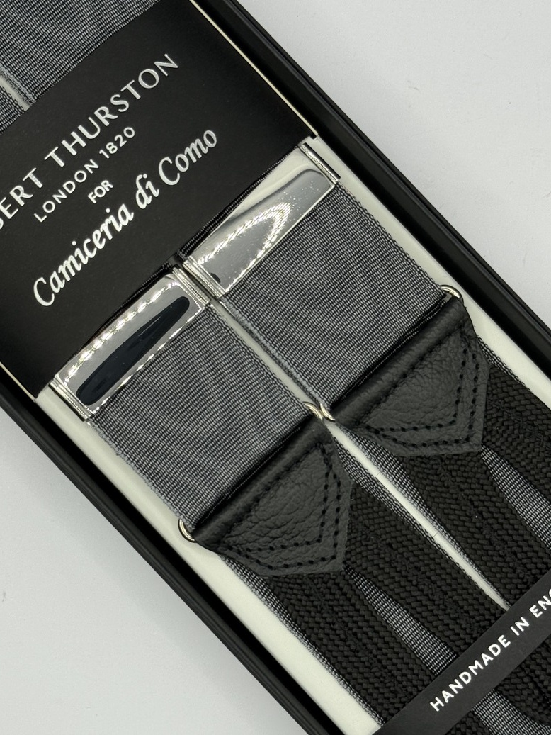 Bretelle grigie Moiré a Y Albert Thurston con attacco per bottoni in passamaneria nera, inserti in pelle nera martellata,. Nastro rigido barathea di larghezza 40mm e regolatori di lunghezza in nickel.