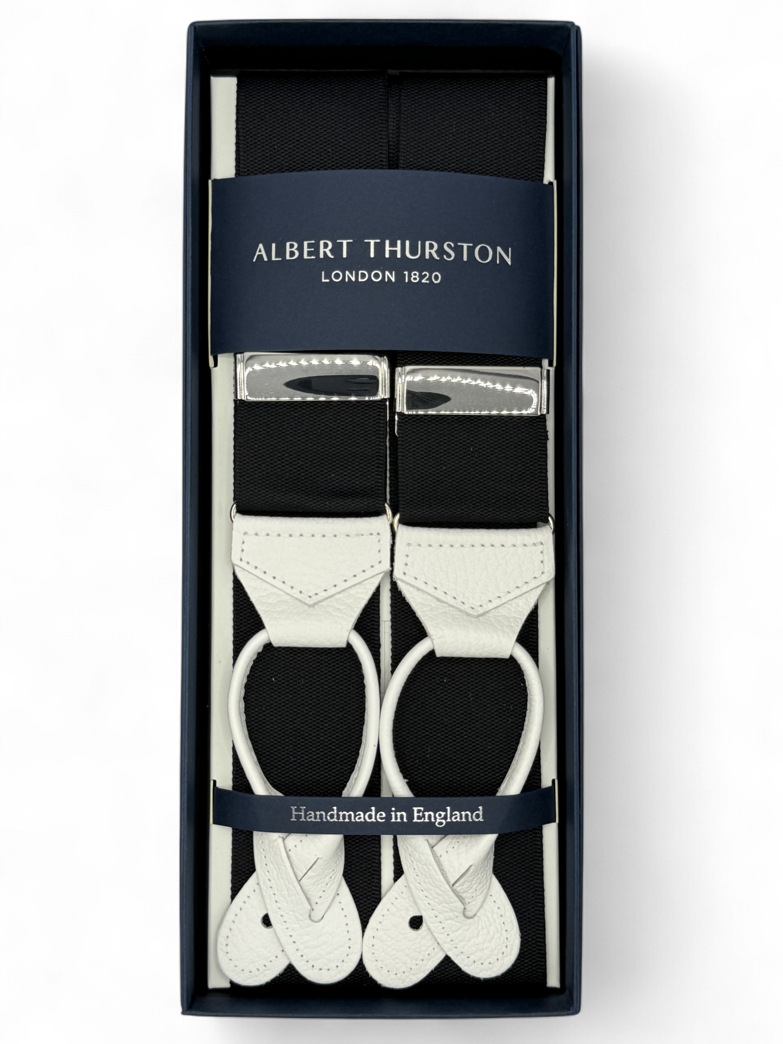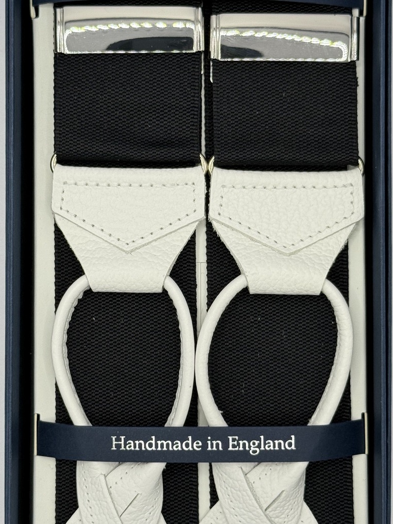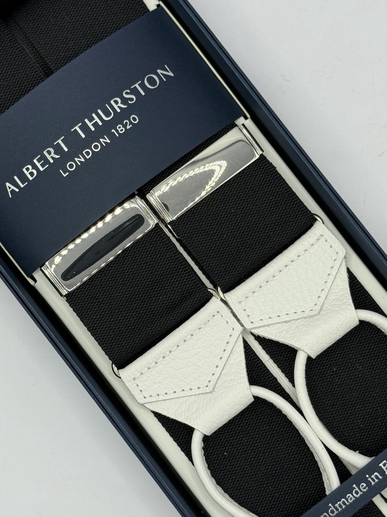 Bretelle nere a Y Albert Thurston con attacco ai bottoni e finiture in vera pelle bianca martellata. Nastro rigido di larghezza 40mm e regolatori di lunghezza nickel.