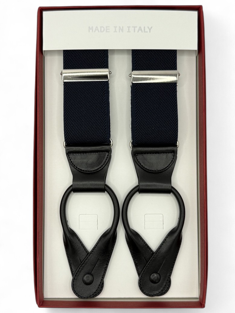 Bretelle Made in Italy, larghezza 35mm, in elastico blu midnight con inserti in pelle nera, finiture nickel e attacco per bottoni con pelle nera. Bretella a Y
