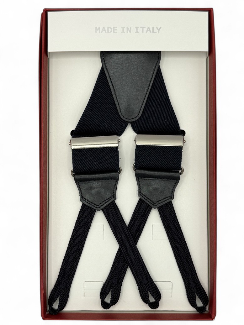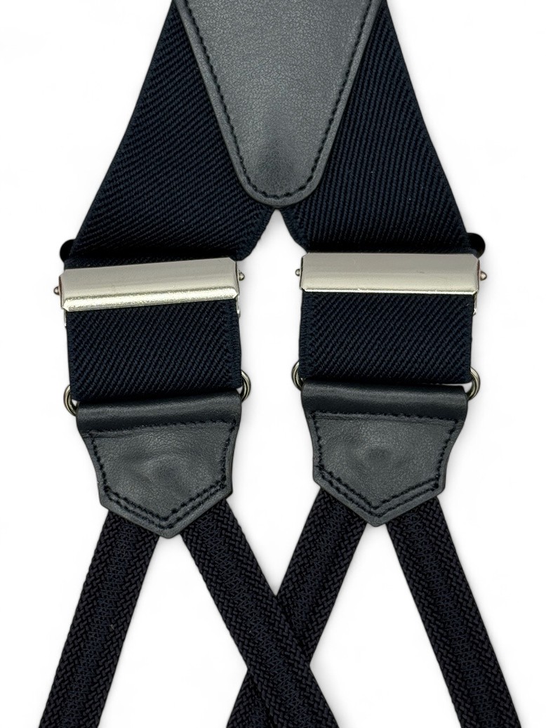 Bretelle Made in Italy, larghezza 35mm, in elastico blu midnight con inserti in pelle nera, finiture nickel e attacco per bottoni con passamaneria nera. Bretella a Y
