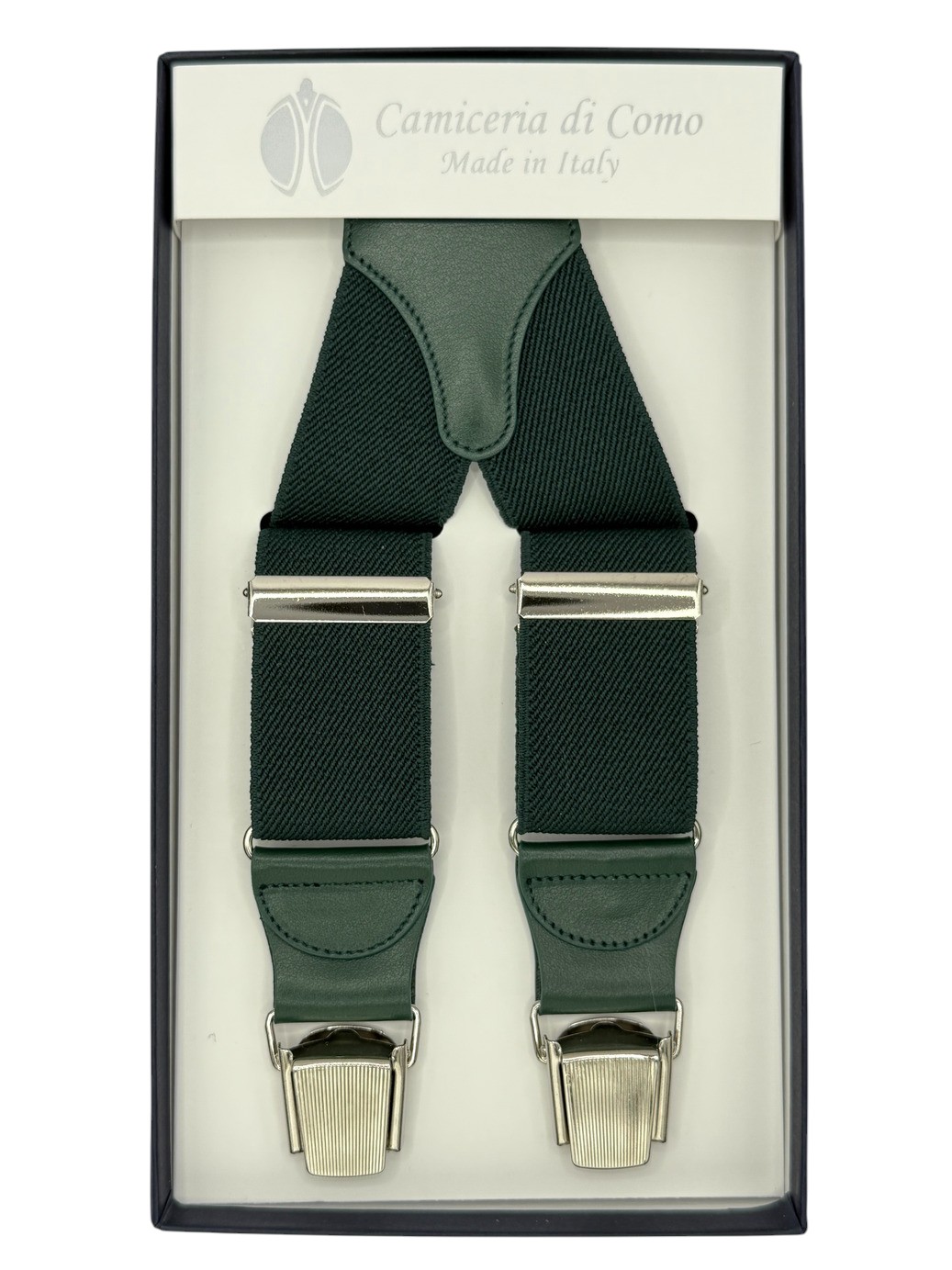 Bretelle Made in Italy, larghezza 35mm, in elastico verde Inglese con inserti in pelle verde e finiture nickel.