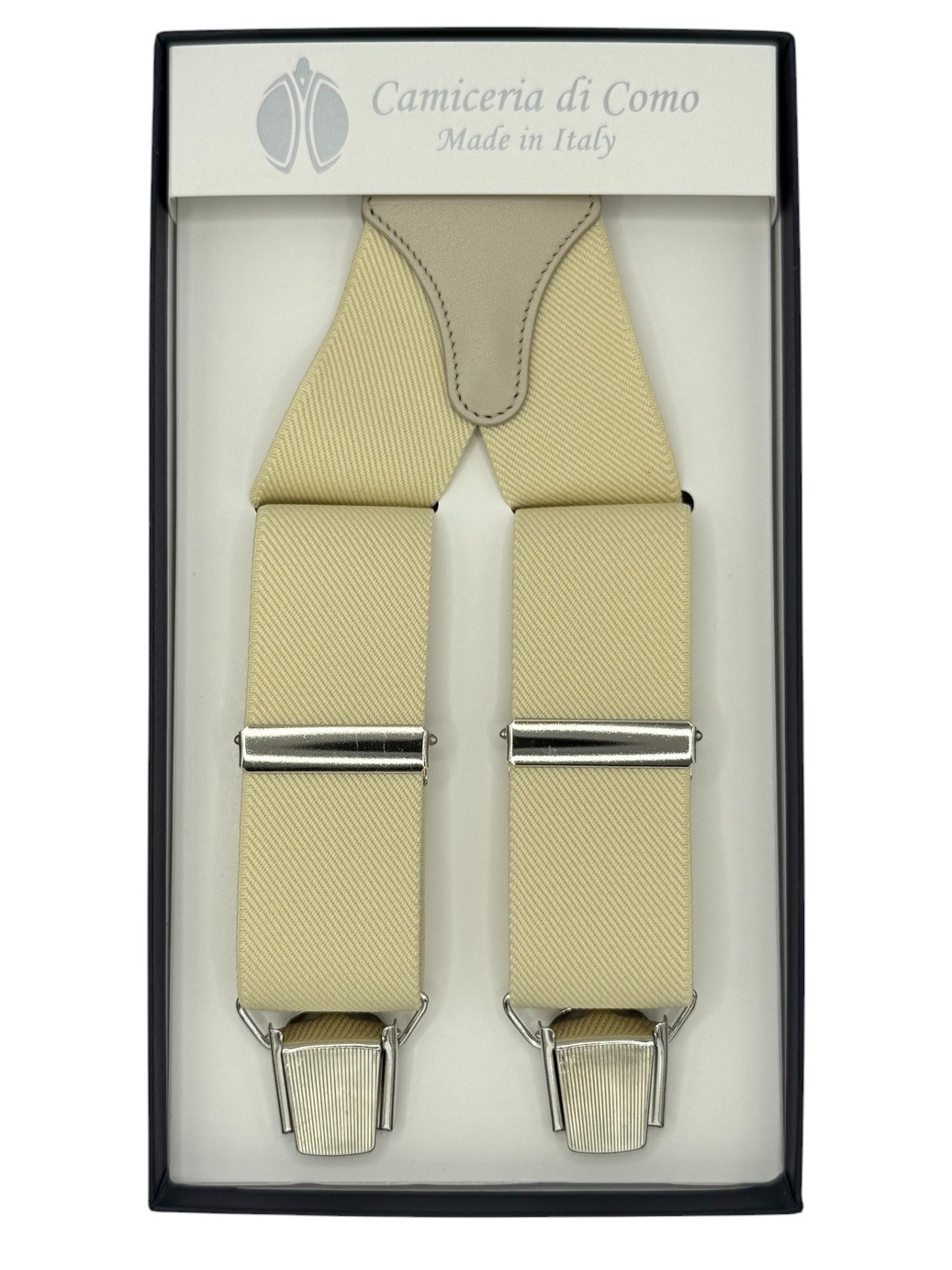 Bretelle Made in Italy, larghezza 35mm, in elastico avorio con inserto in pelle beige e finiture nickel.