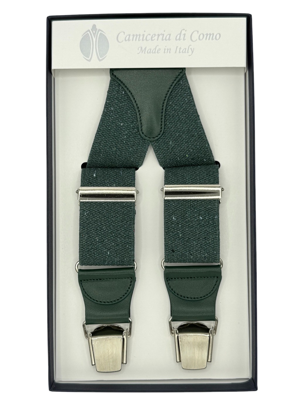 Bretelle Made in Italy, larghezza 35mm, in elastico verde con effetto vintage, inserto in pelle verde e finiture nickel.