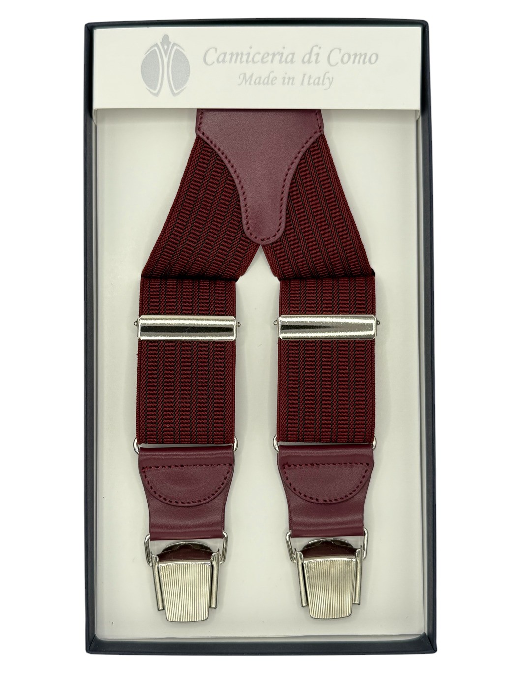 Bretelle Made in Italy, larghezza 35mm, in elastico con righe tono su tono di colore bordeaux.