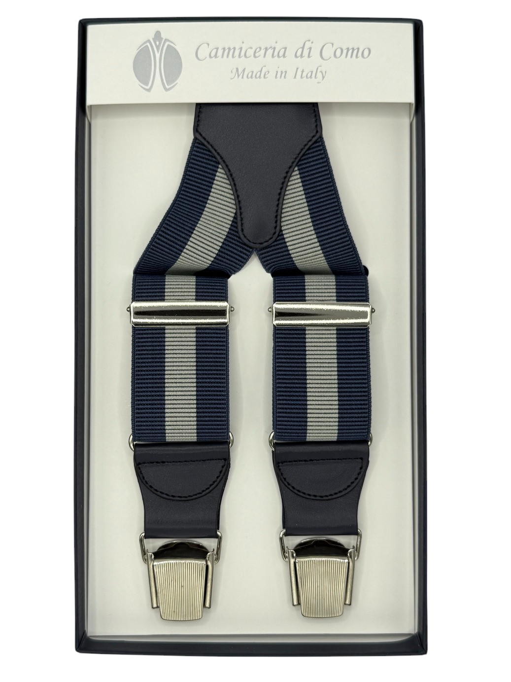 Bretelle Made in Italy, larghezza 35mm, in elastico con righe di colore blu avio e grigio.