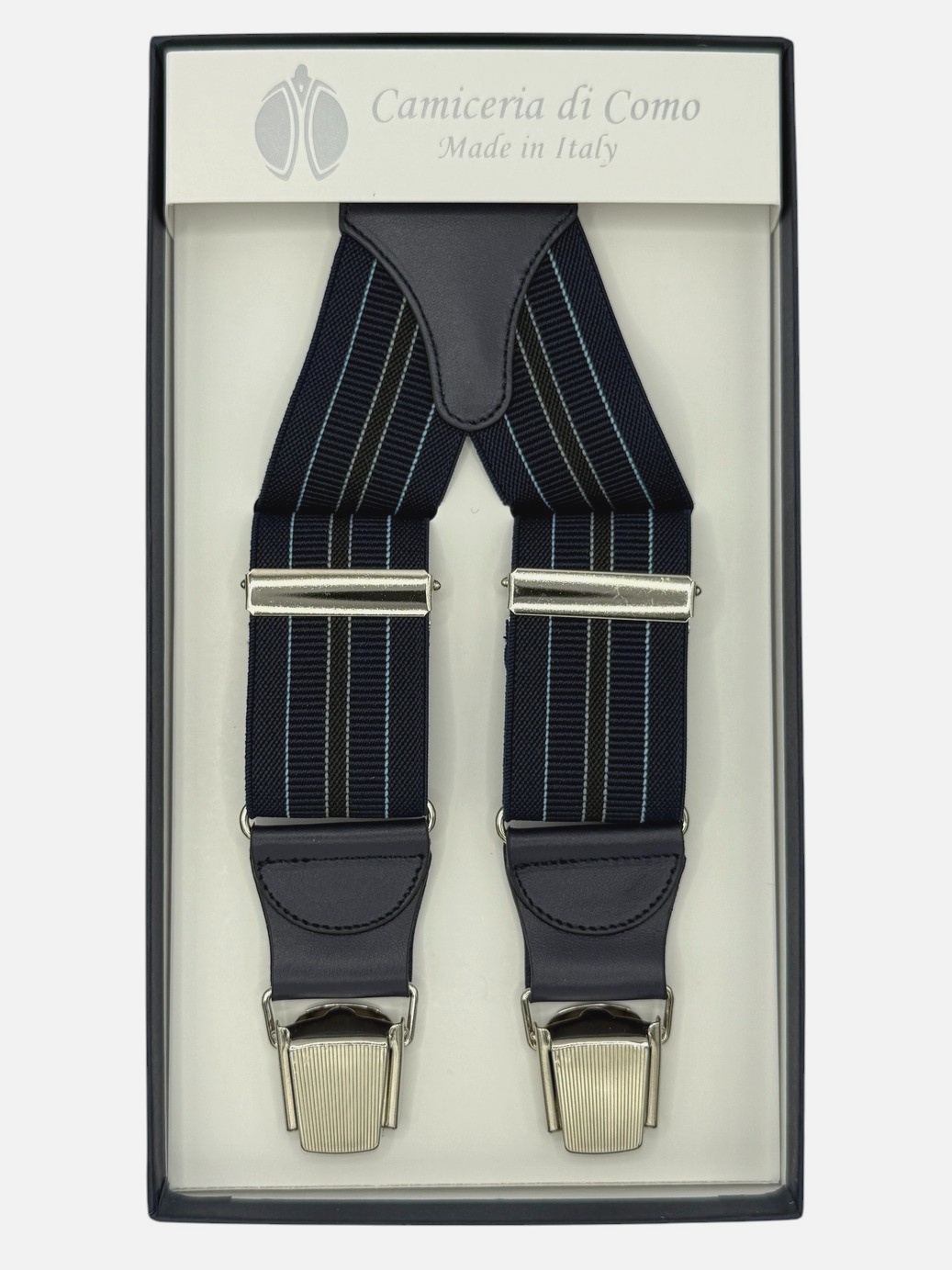 Bretelle Made in Italy, larghezza 35mm, in elastico blu con righe blu e marroni e con righe fini bianche ed azzurre.