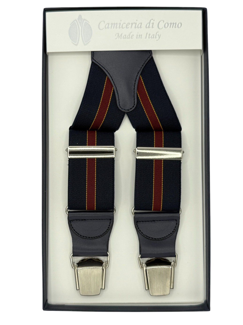 Bretelle Made in Italy, larghezza 35mm, in elastico blu con riga bordeaux e riga fine gialla.
