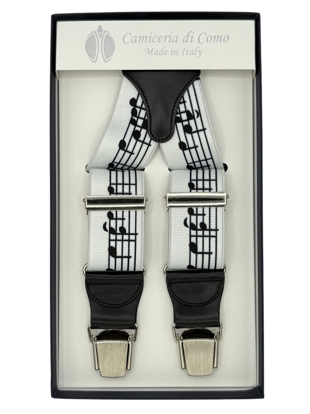 Bretelle Made in Italy, larghezza 35mm, in elastico con note musicali bianco e nero.