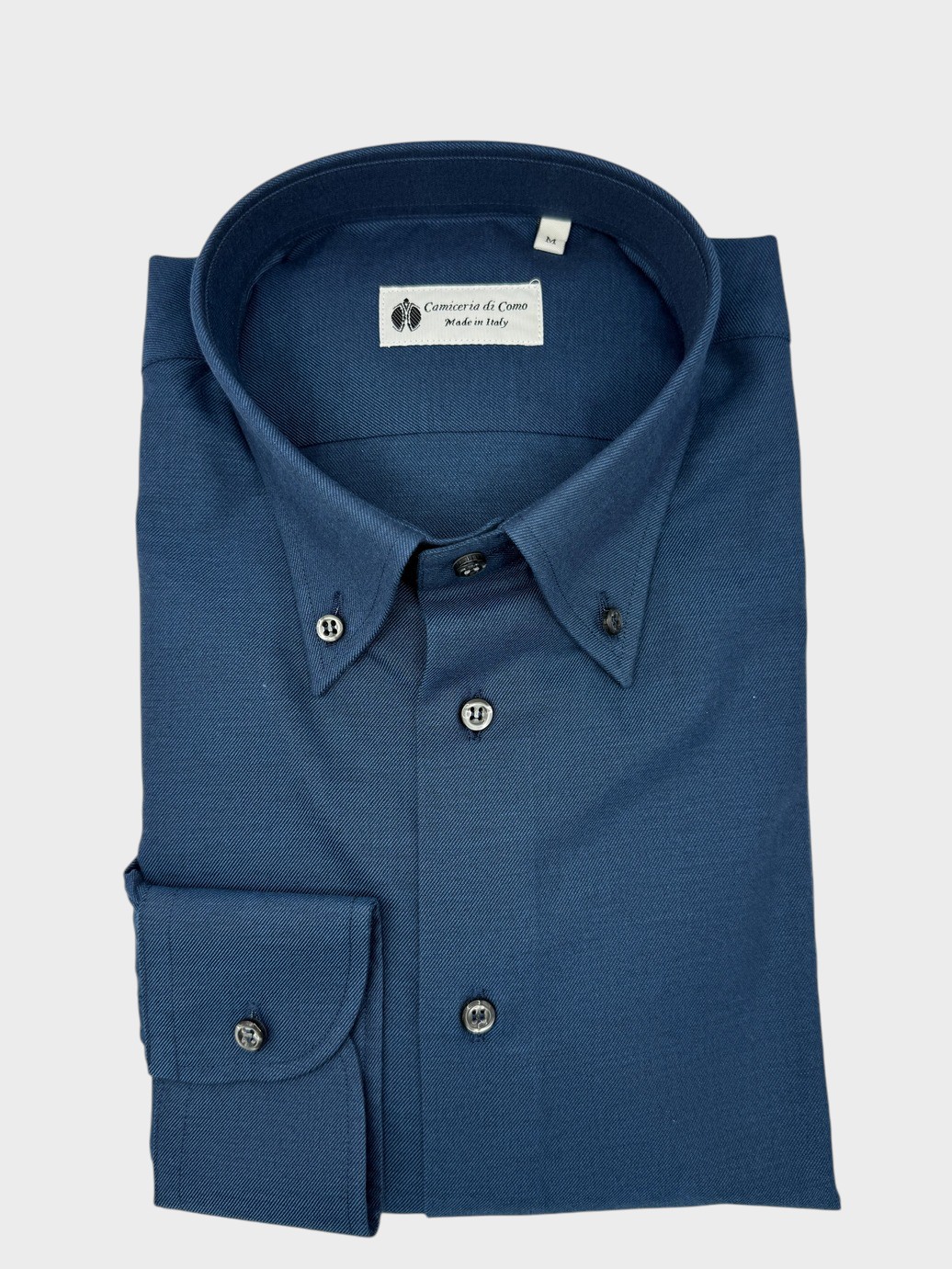Tessuto twill. Composizione 80% cotone 20% lana. Tinta unita colore blu ottanio. Collo button down, polso stondato, senza tasca. Autunno/Inverno.