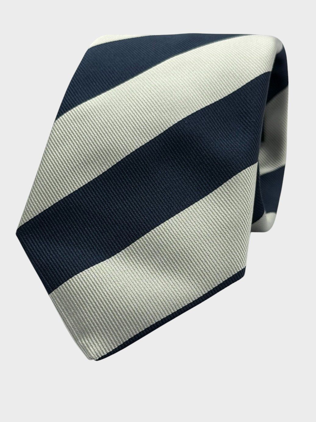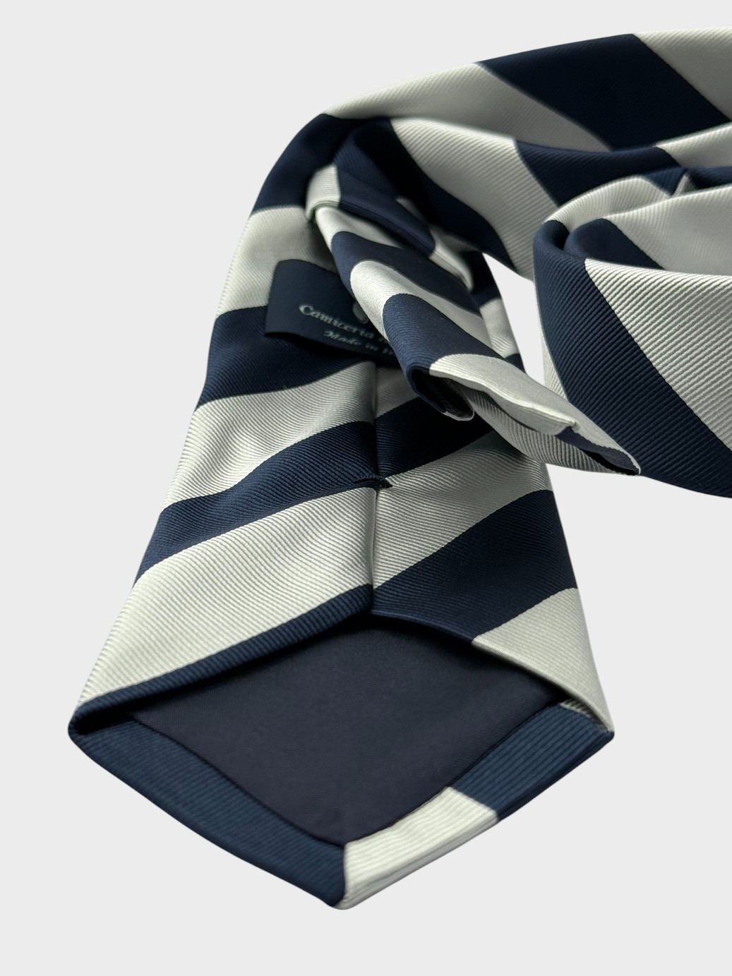 Cravatta da uomo realizzata in Italia con 100% seta jacquard di alta qualità, proveniente dalle rinomate seterie di Como. Cucita a mano. A righe coloe grigio e blu. Larghezza 8 cm, lunghezza 150 cm. Un accessorio raffinato e versatile, perfetto per aggiungere un tocco di colore e stile a un outfit formale o casual elegante. La seta jacquard, con la sua trama in rilievo, e il design ricercato conferiscono un aspetto sofisticato e di tendenza.