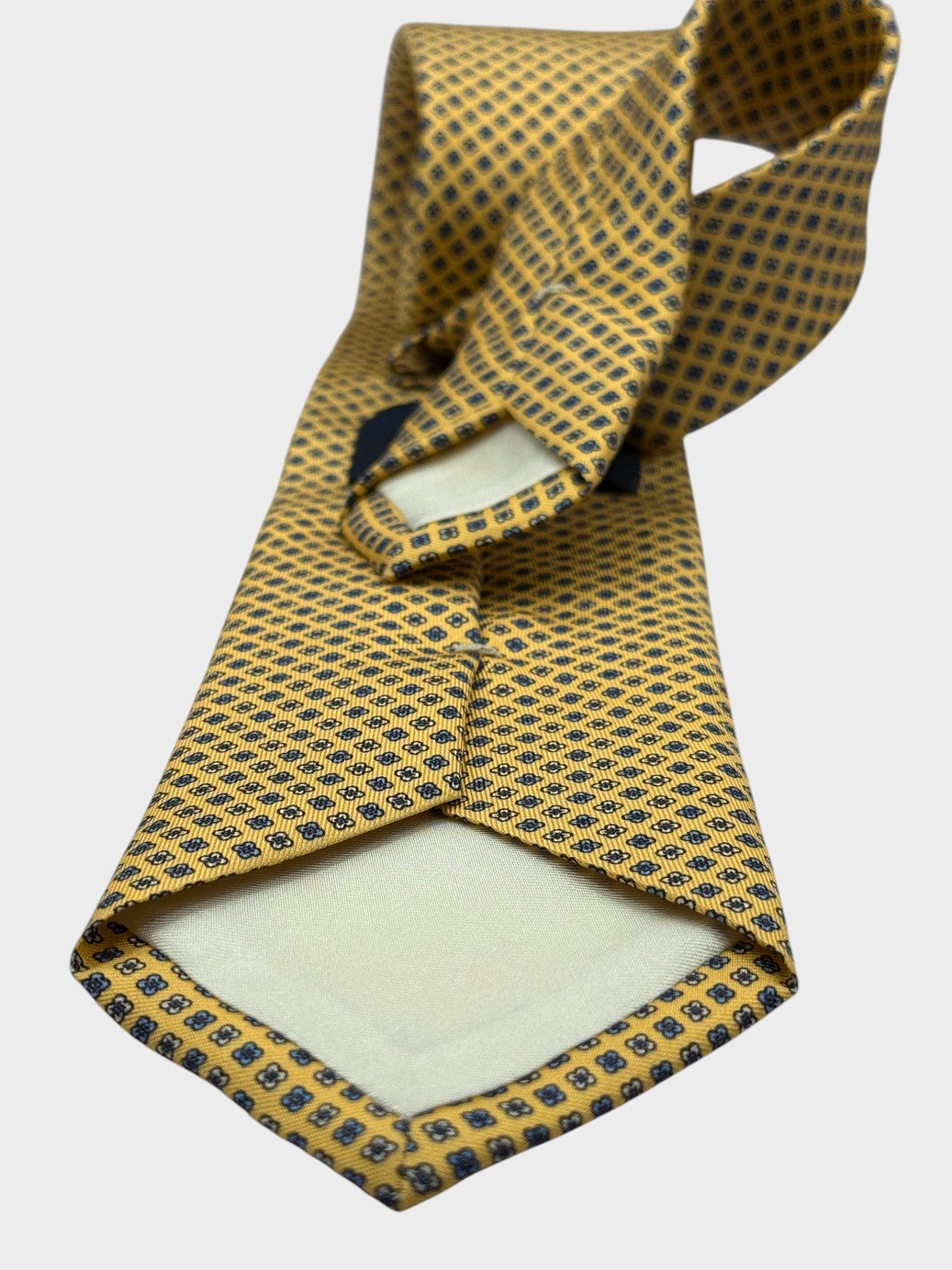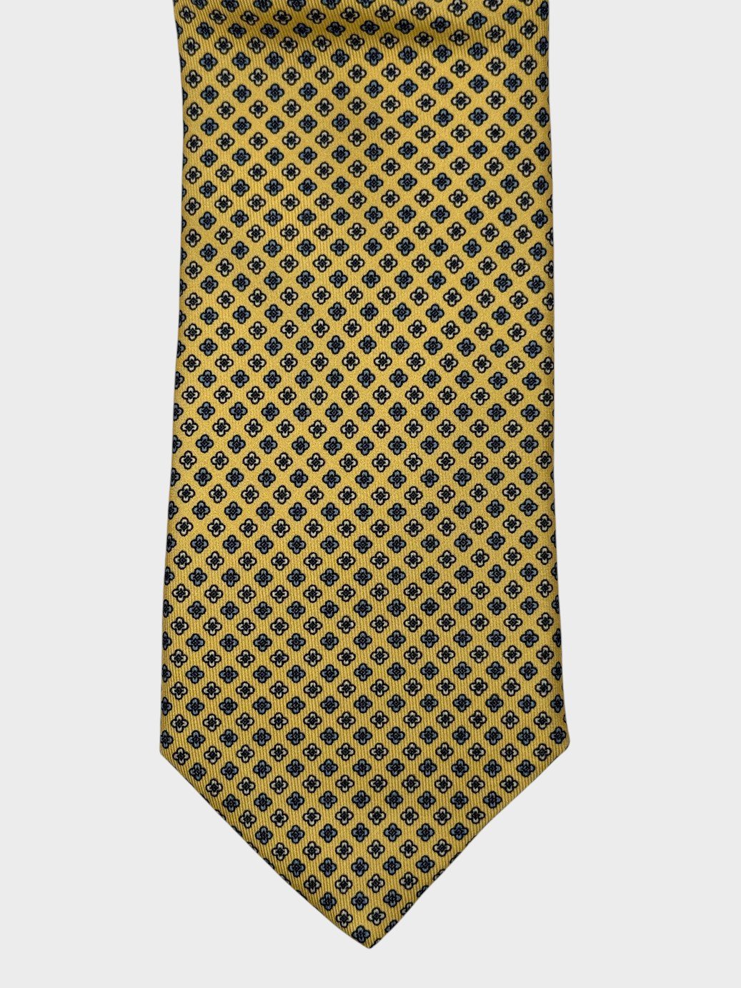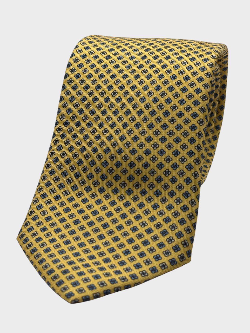 Cravatta da uomo realizzata in Italia con 100% seta stampata di alta qualità, proveniente dalle rinomate seterie di Como. Cucita a mano. Cravatta gialla con motivi azzurri e bianchi. Larghezza 8 cm, lunghezza 150 cm. Un accessorio raffinato e versatile, perfetto per aggiungere un tocco di colore e stile a un outfit formale o casual elegante. La seta jacquard, con la sua trama in rilievo, e il design ricercato conferiscono un aspetto sofisticato e di tendenza.