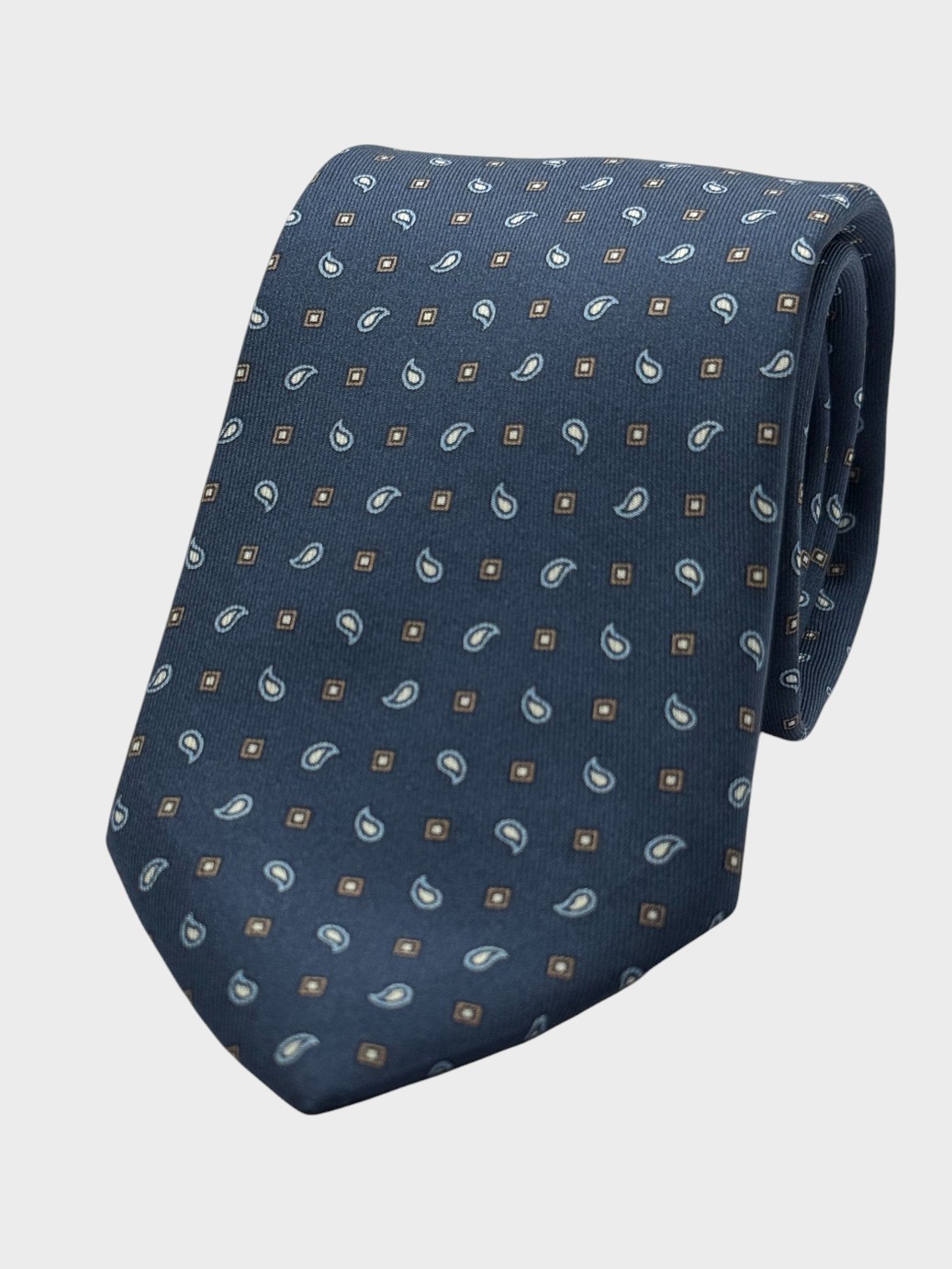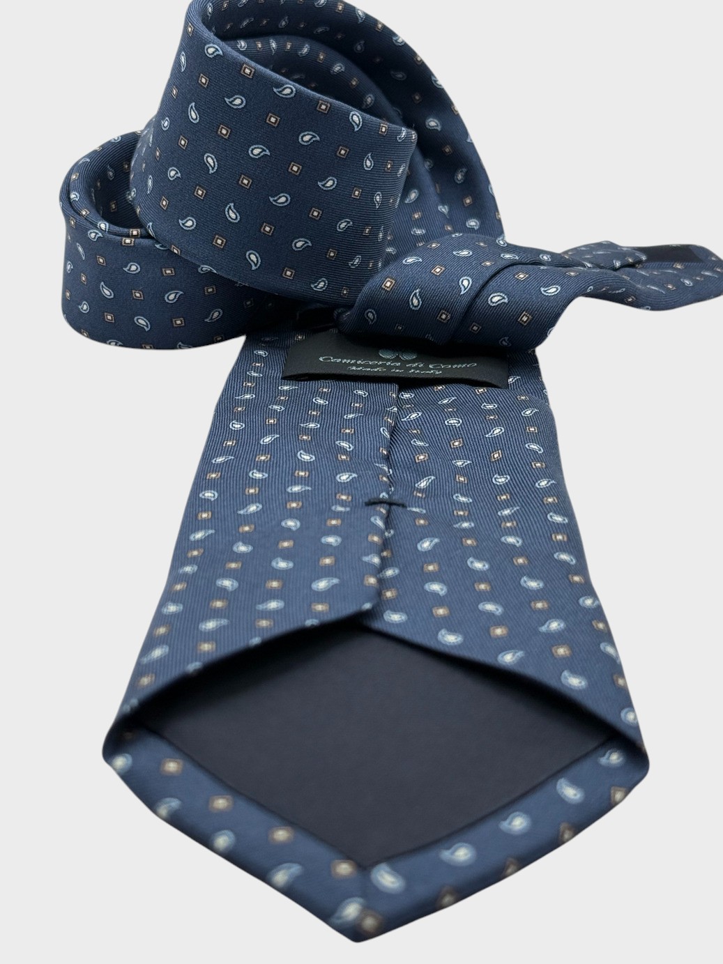 Cravatta da uomo realizzata in Italia con 100% seta stampata di alta qualità, proveniente dalle rinomate seterie di Como. Cucita a mano. Cravatta blu con motivi marroni, azzurri e bianchi. Larghezza 8 cm, lunghezza 150 cm. Un accessorio raffinato e versatile, perfetto per aggiungere un tocco di colore e stile a un outfit formale o casual elegante. La seta jacquard, con la sua trama in rilievo, e il design ricercato conferiscono un aspetto sofisticato e di tendenza.