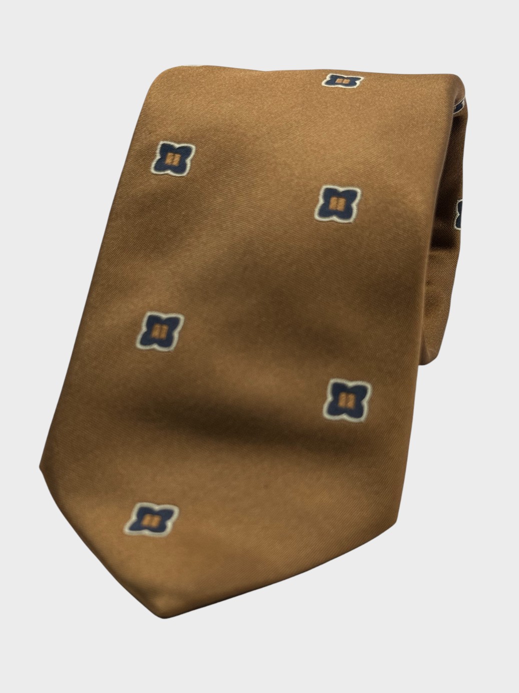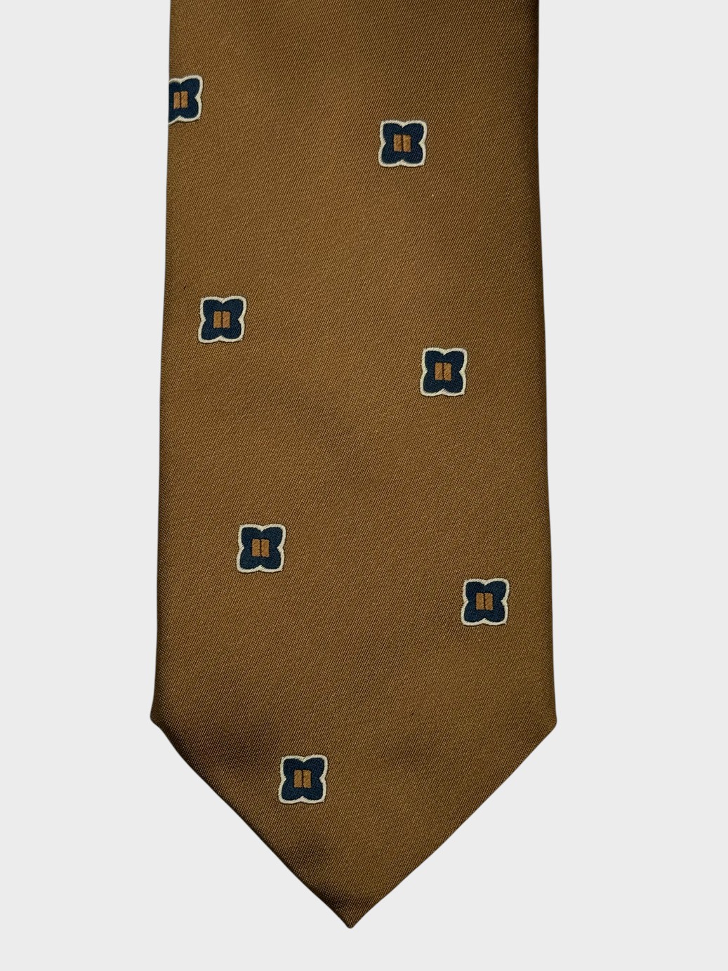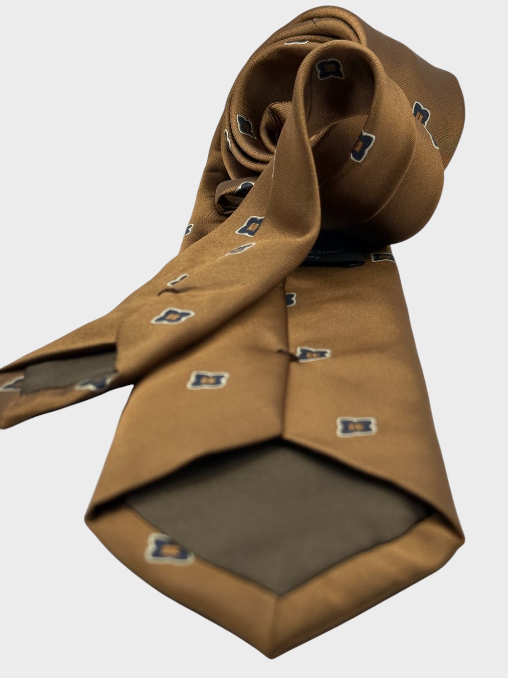 Cravatta da uomo realizzata in Italia con 100% seta jacquard di alta qualità, proveniente dalle rinomate seterie di Como. Cucita a mano. Cravatta marrone bronzo con motivi tono su tono, blu e bianchi. Larghezza 8 cm, lunghezza 150 cm. Un accessorio raffinato e versatile, perfetto per aggiungere un tocco di colore e stile a un outfit formale o casual elegante. La seta jacquard, con la sua trama in rilievo, e il design ricercato conferiscono un aspetto sofisticato e di tendenza.