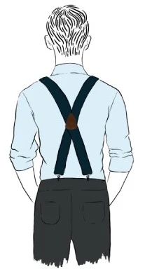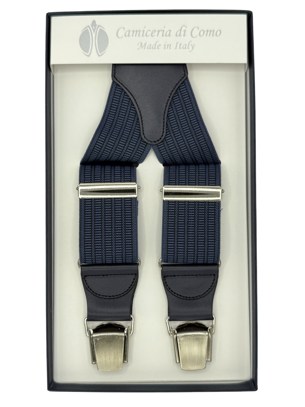 Attacco con 4 clips ad alta tenuta e finiture in pelle blu navy. Bretella a X